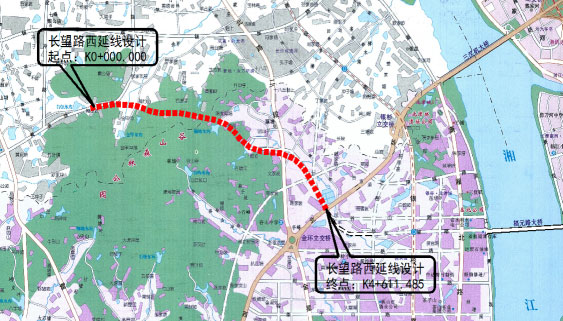 長望路西延線位于湘江新區(qū)范圍內(nèi),路線呈東西走向。道路西接黃金大道,往東沿谷山森林公園北側(cè)山體埡口,穿過龍湖湘風(fēng)原著,往東接現(xiàn)狀金星北路,再向東南連接現(xiàn)狀西二環(huán),道路全長4.611KM,并對(duì)長望路(西二環(huán)-觀沙路)段進(jìn)行了改擴(kuò)建設(shè)計(jì),長度0.611KM,金星路、黃金大道立交范圍內(nèi)的主線及輔道進(jìn)行改造。本標(biāo)段范圍為K0+000-K1+520。其中包括跨線一座、下穿式矩形框架橋一座、地下人行通道一座,線路設(shè)計(jì)為城市主干路、設(shè)計(jì)車速60km/h。