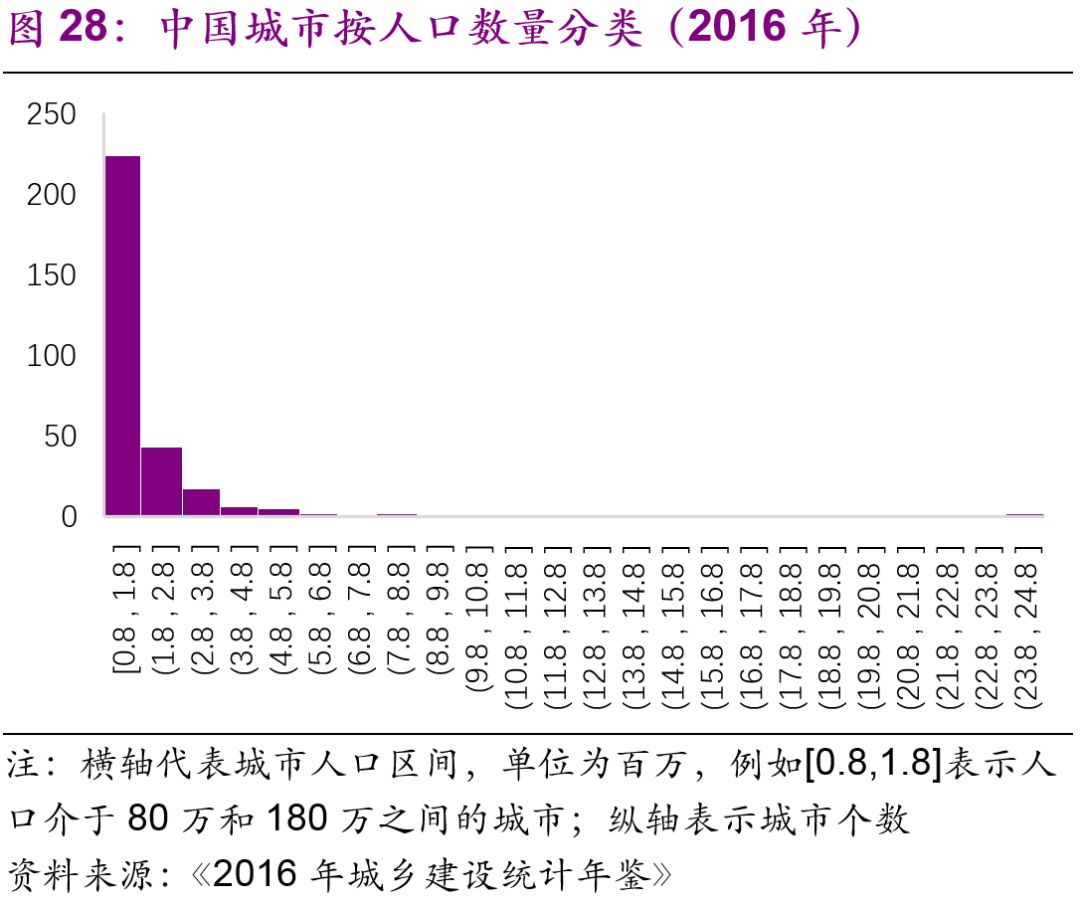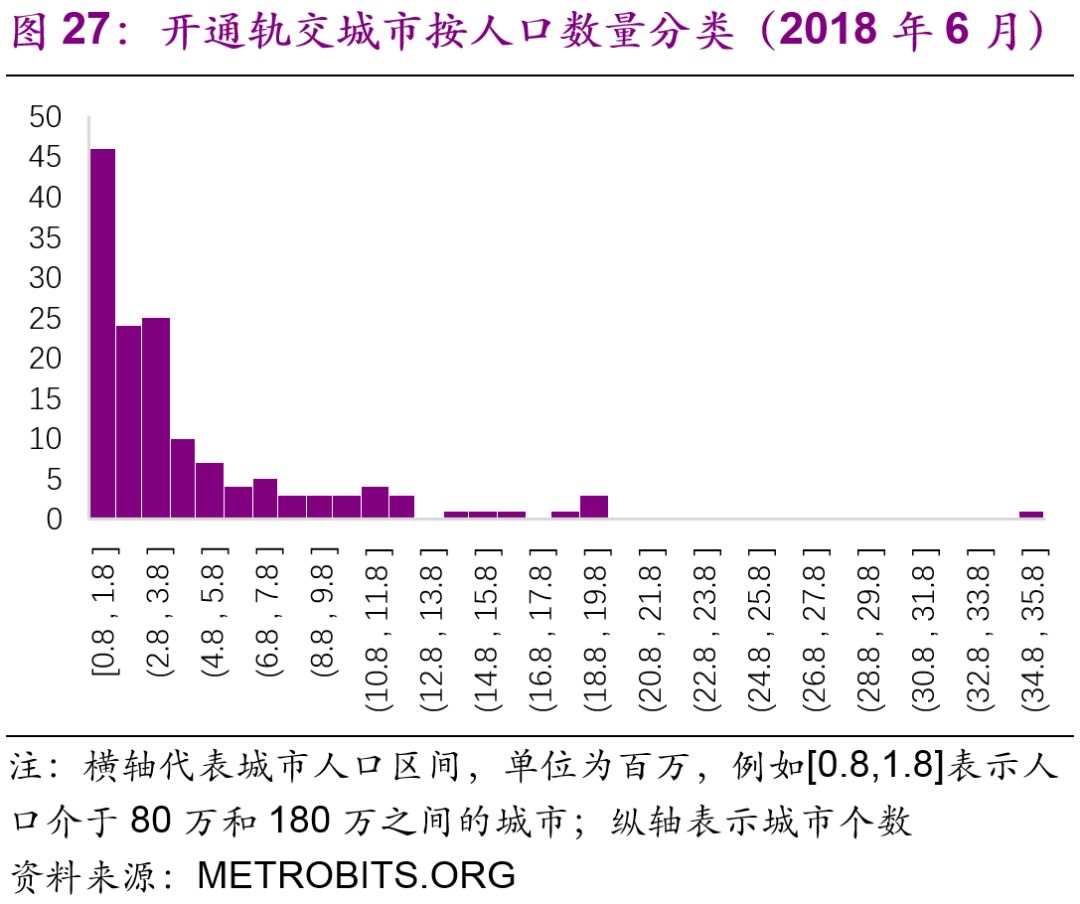 擬建地鐵、輕軌線路初期客運強度分別不低于每日每公里0.7萬人次、0.4萬人次,遠期客流規(guī)模分別達到單向高峰小時3萬人次以上、1萬人次以上。但是同時也強調(diào)了:“以上申報條件將根據(jù)經(jīng)濟社會發(fā)展情況按程序適時調(diào)整?!?016年,中國城市中市區(qū)常住人口在150萬以上的城市共有111個,對比目前已經(jīng)開通軌道交通的城市數(shù)量(34個),仍有一定的發(fā)展空間。而從國際上看,建設軌道交通的城市人口的起點[19]大約為100萬(圖27),如果長期內(nèi)中國將建設軌道交通的人口標準下調(diào)至100萬,那么將有225個城市符合標準(圖28)。