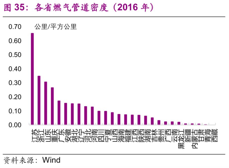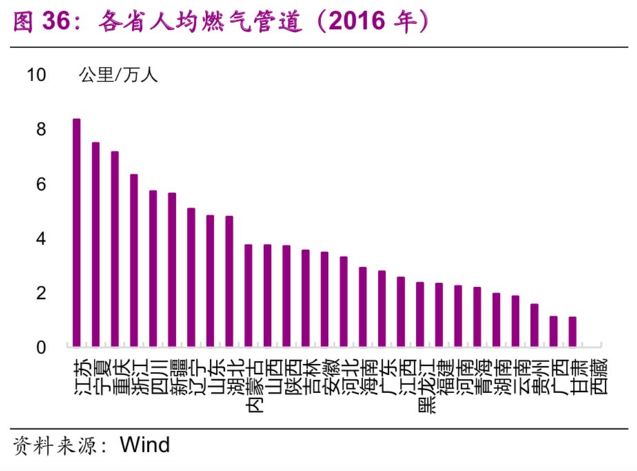 能源基礎設施方面,東部地區(qū)普遍高于中西部地區(qū)。2016年,燃氣管道密度排名前三的是江蘇(0.65公里/平方公里)、浙江(0.35公里/平方公里)、山東(0.31公里/平方公里)(圖35);人均燃氣管道[22]排名前三的也是浙江(8.4公里/萬人)、寧夏(7.5公里/萬人)、重慶(7.2公里/萬人)(圖36)。