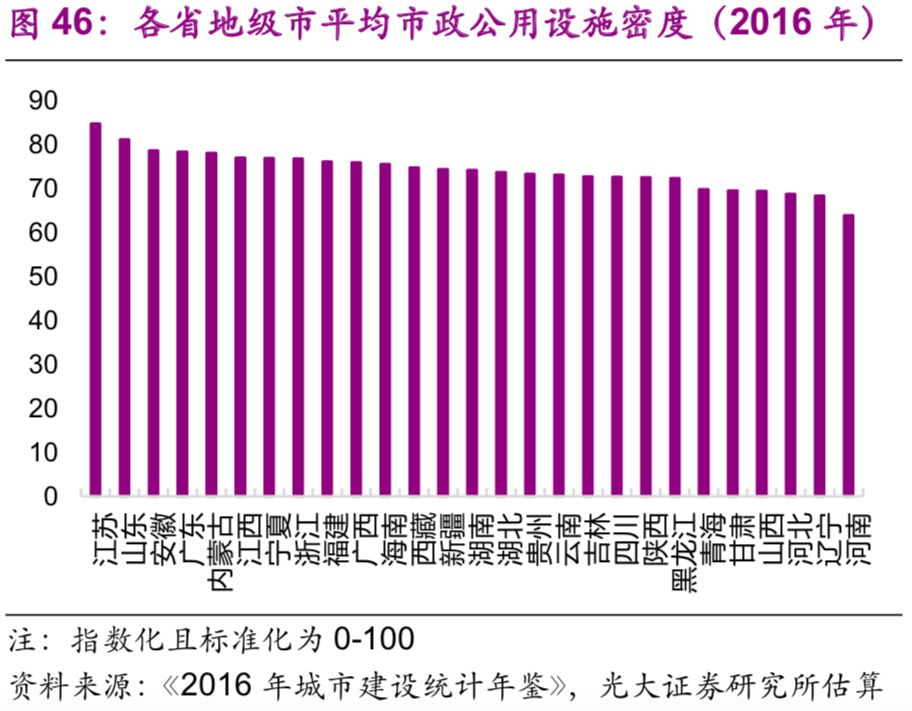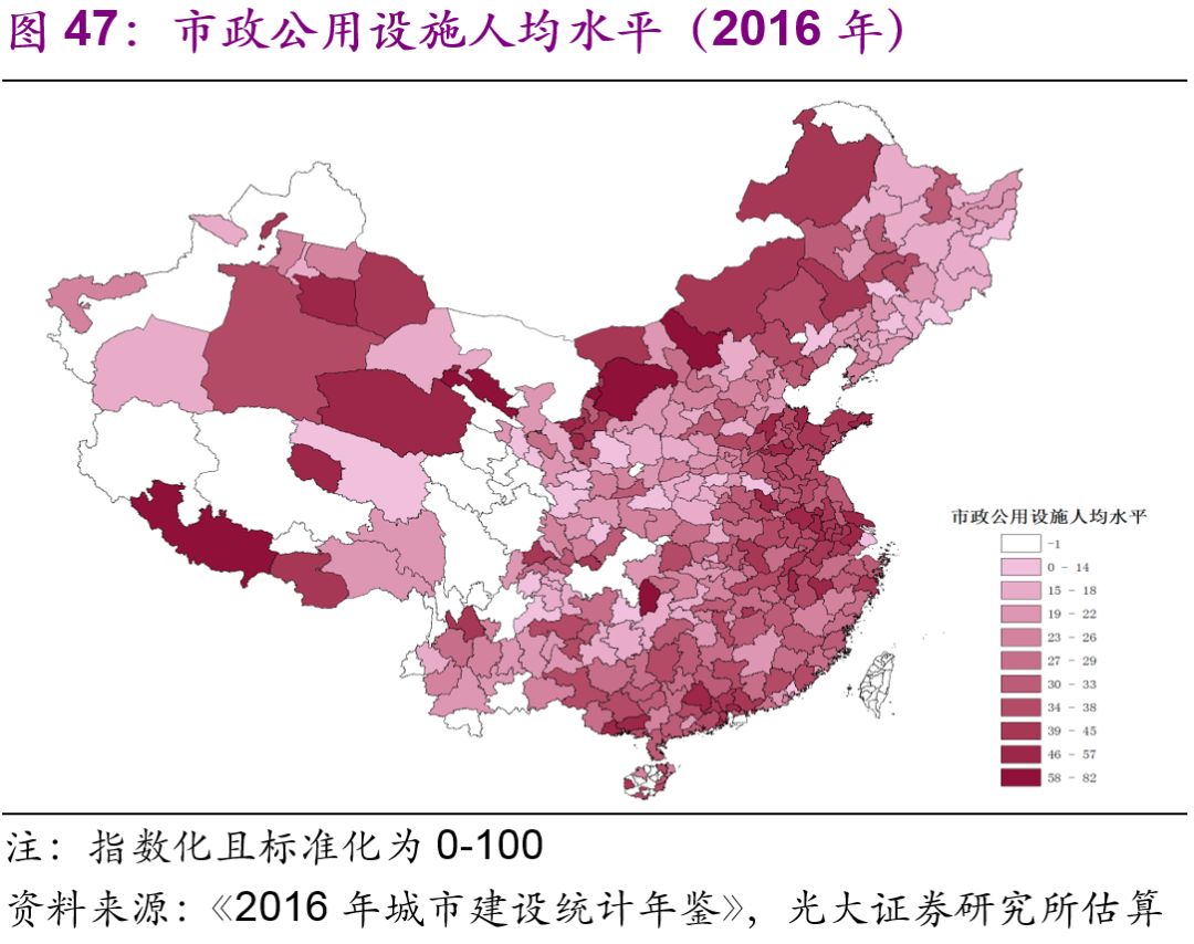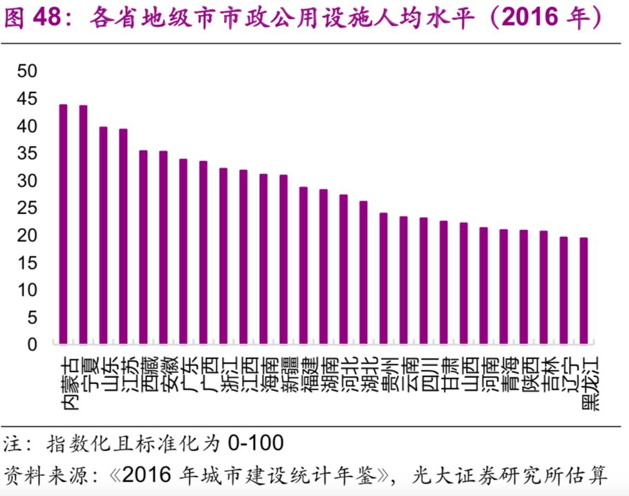 城市市政公用設施投資結構不斷變化。隨著中國城鎮(zhèn)化的不斷推進,2016年投資額達1.7萬億元的城市市政公用設施投資結構有了較大變化:1990年占據(jù)較大比重的燃氣(16%)、供水(20%)隨著滲透率觸及“天花板[26]”后比重下降較快,兩者2016年的比重分別為2%、3%;而更能體現(xiàn)城市功能升級的公共交通、道路橋梁等的比重上升較快,1990年兩者的比重分別為8%、26%,2016年則分別為23%、43%;此外,許多新型的城市市政公用設施投資開始出現(xiàn),例如地下綜合管廊,2016年占比達到了1.7%(圖44)。